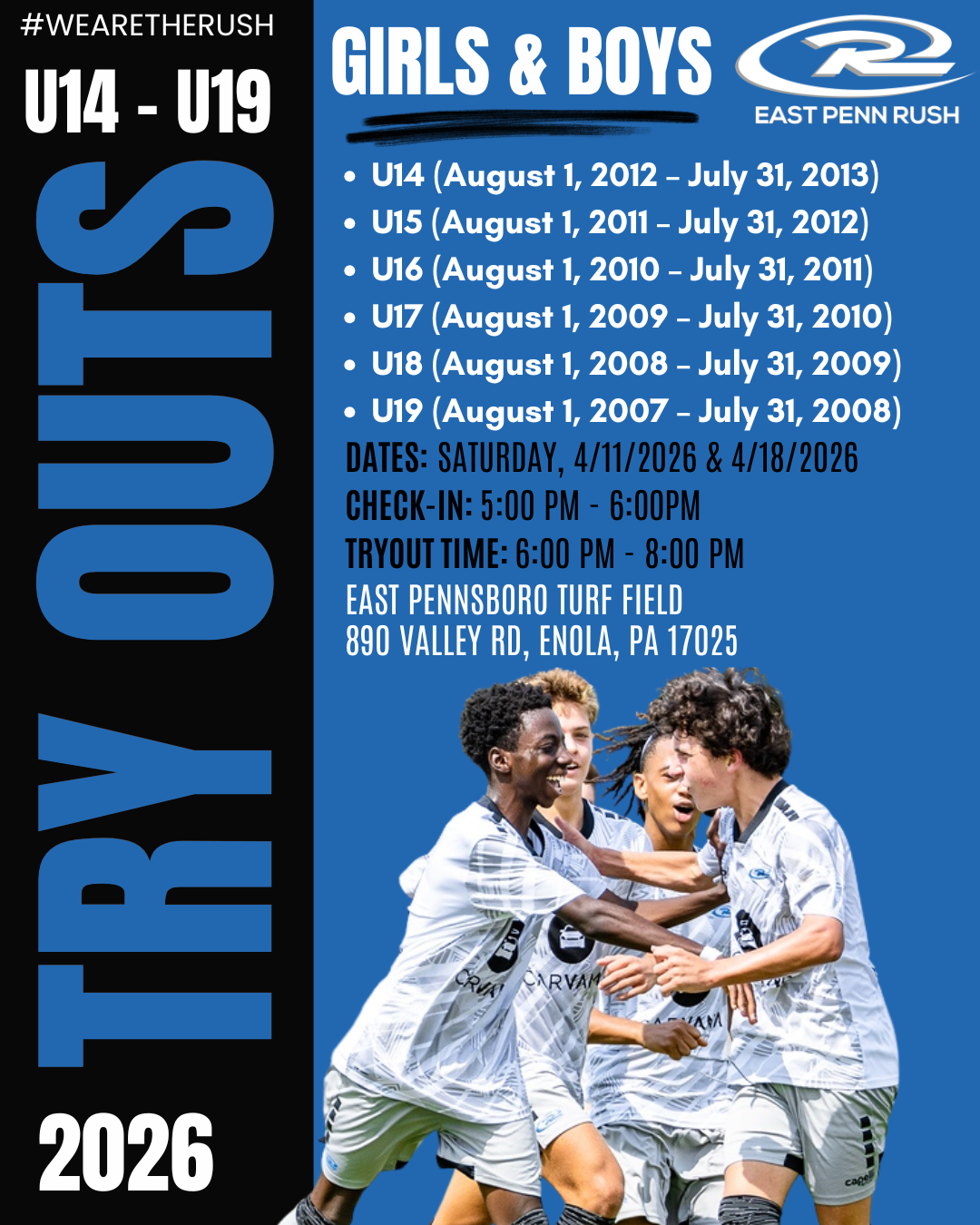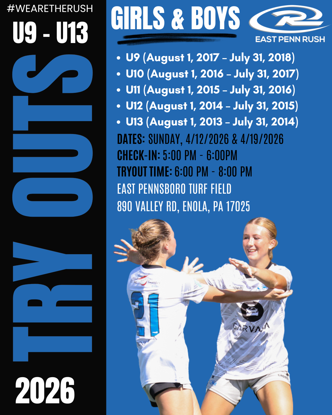 On behalf of East Penn Rush, we would like to extend our heartfelt thanks for expressing your interest in attending our upcoming tryouts. We are thrilled that you are considering joining our soccer community.